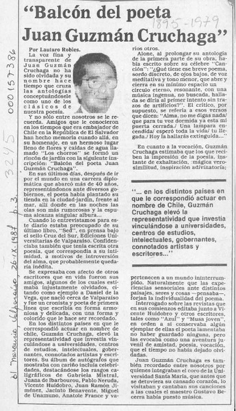 "Balcón del poeta Juan Guzmán Cruchaga" [artículo] Lautaro Robles.