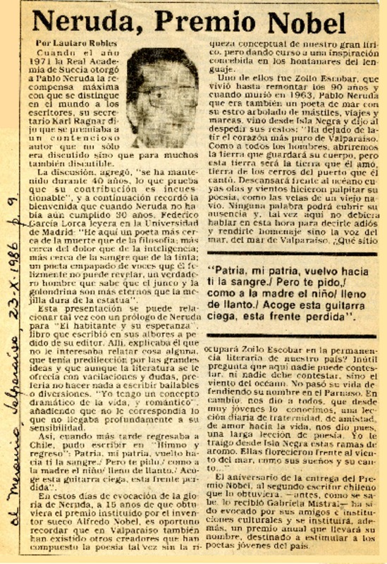 Neruda, Premio Nobel [artículo] Lautaro Robles.