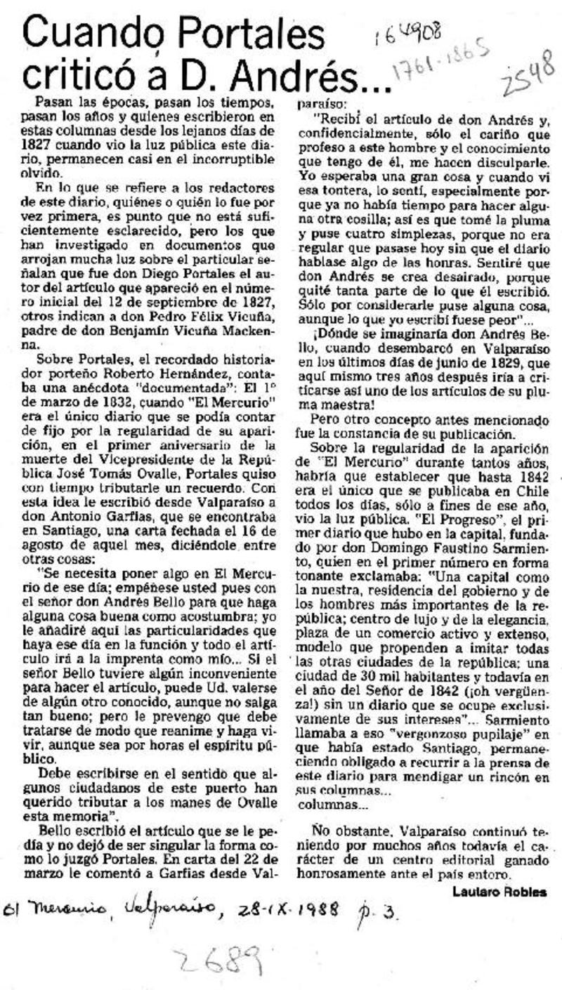 Cuando Portales criticó a D. Andrés -- [artículo] Lautaro Robles.
