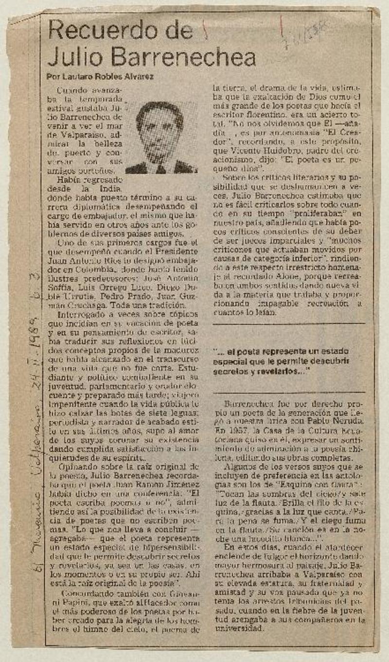 Recuerdo de Julio Barrenechea [artículo] Lautaro Robles Alvarez.