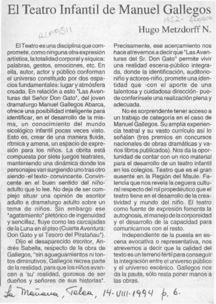 El teatro infantil de Manuel Gallegos [artículo] Hugo Metzdorff N.