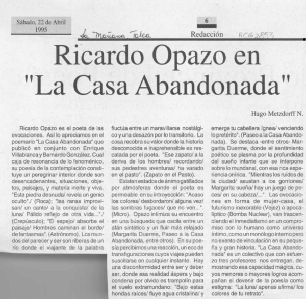 Ricardo Opazo en "La casa abandonada" [artículo] Hugo Metzdorff N.