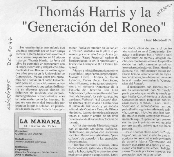 Tomás Harris y la "Generación del roneo" [artículo] Hugo Metzdorff N.