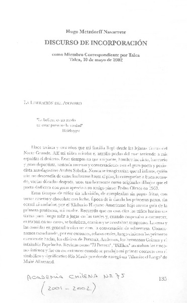 Discurso de incorporación [artículo] Hugo Metzdorf Navarrete.