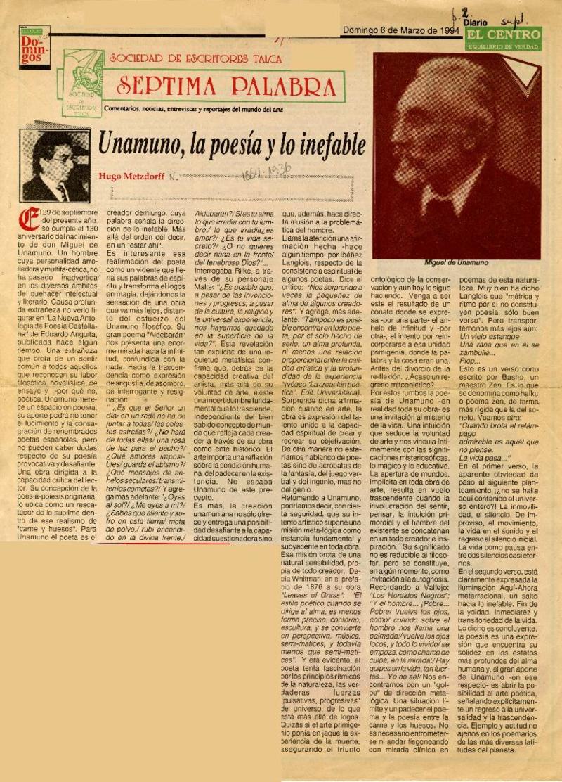 Unamuno, la poesía y lo inefable [artículo] Hugo Metzdorff.