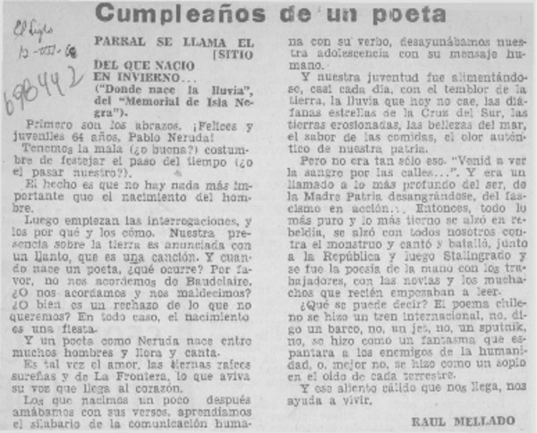 Cumpleaños de un poeta [artículo] Raúl Mellado.