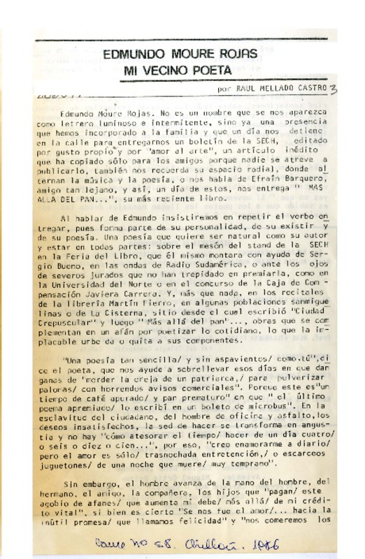 Edmundo Moure Rojas, mi vecino poeta [artículo] Raúl Mellado Castro.
