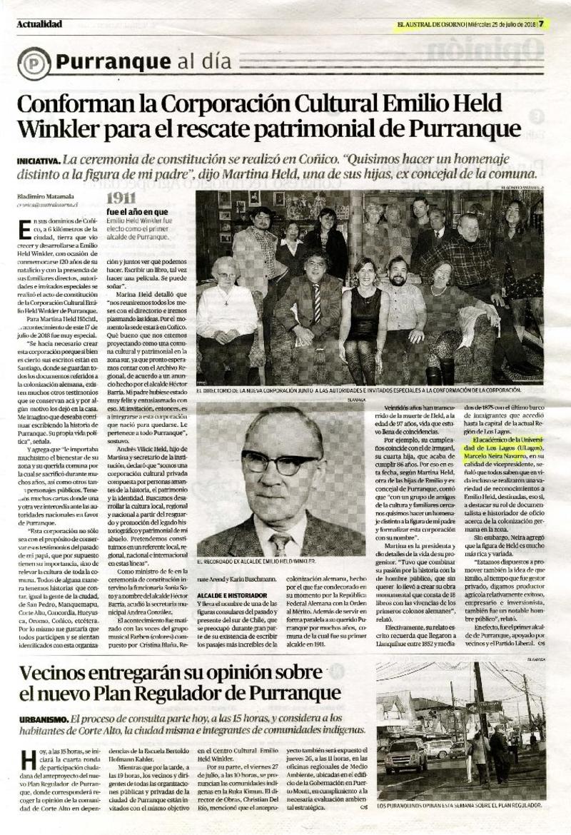Conforman la Corporación Cultural Emilio Held Winkler para el rescate de Purranque [artículo] Bladimiro Matamala.