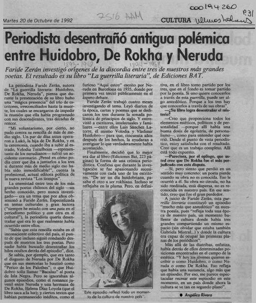 Periodista desentrañó antigua polémica entre Huidobro, De Rokha y Neruda [artículo] Angélica Rivera.