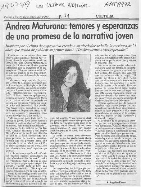 Andrea Maturana, temores y esperanzas de una promesa de la narrativa joven [artículo] Angélica Rivera.