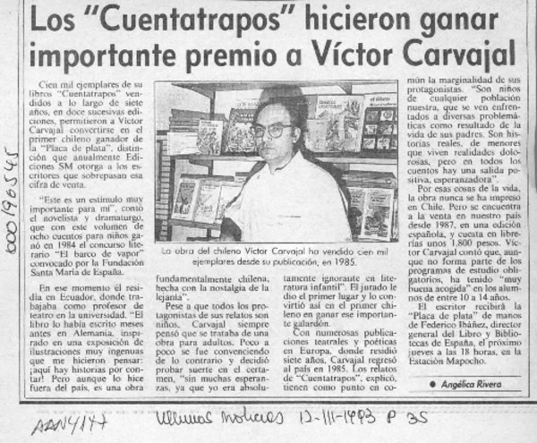 Los "Cuentatrapos" hicieros ganar importante premio a Víctor Carvajal [artículo] Angélica Rivera.