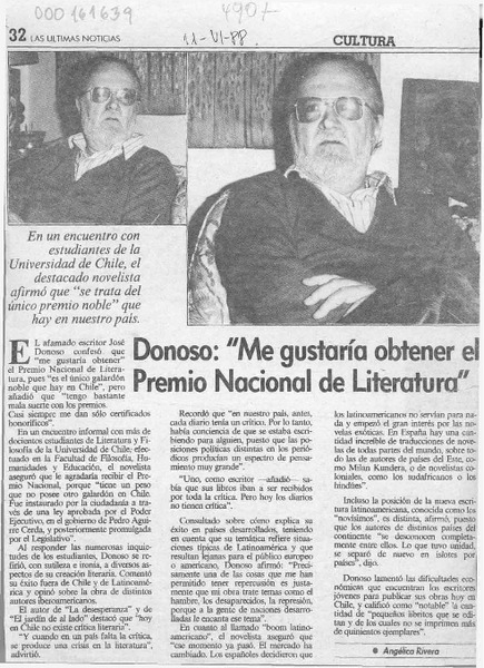 Donoso, "Me gustaría obtener el Premio Nacional de Literatura" [artículo] Angélica Rivera.