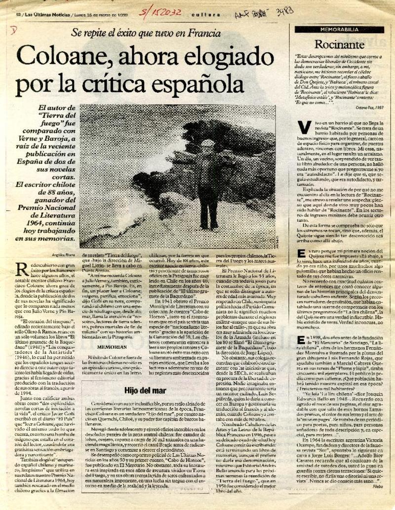 Coloane, ahora elogiado por la crítica española [artículo] Angélica Rivera.