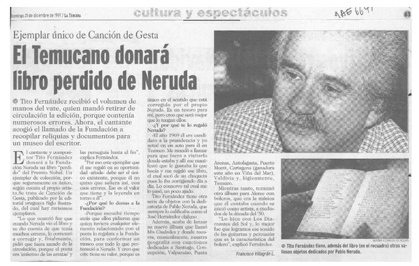 El Temucano donará libro perdido de Neruda [artículo] Francisco Villagrán L.