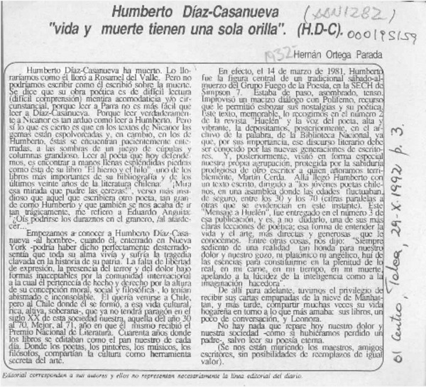 Humberto Díaz Casanueva "vida y muerte tienen una sola orilla" [artículo] Hernán Ortega Parada.