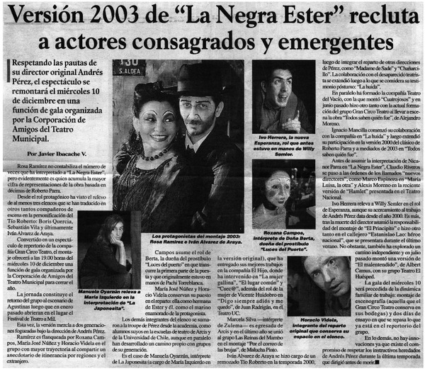 Versión 2003 de "La Negra Ester" recluta a actores consagrados y emergentes [artículo] Javier Ibacache V.