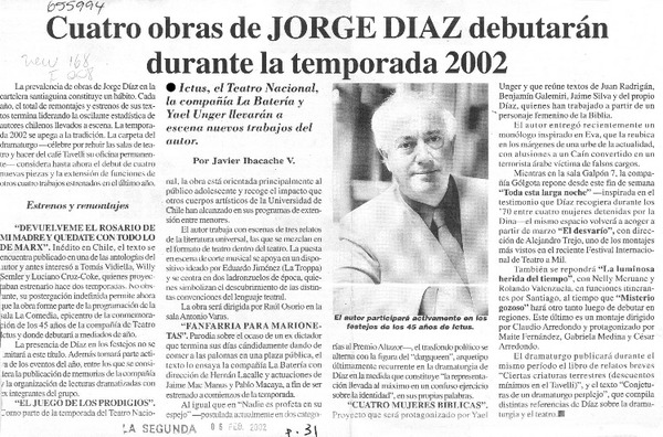 Cuatro obras de Jorge Díaz debutarán durante la temporada 2002 [artículo] Javier Ibacache V.
