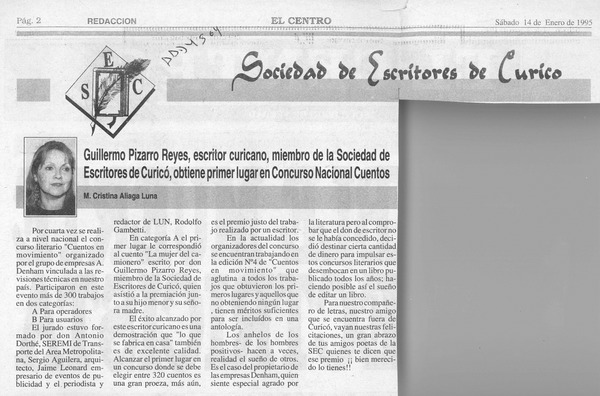 Guillermo Pizarro Reyes, escritor curicano, miembro de la Sociedad de Escritores de Curicó, obtiene primer lugar en concurso nacional cuentos [artículo] M. Cristina Aliaga Luna.