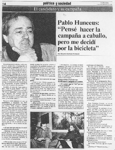 Pablo Huneeus, "Pensé hacer la campaña a caballo, pero me decidí por la bicicleta" [artículo] Rosario Guzmán Errázuriz.