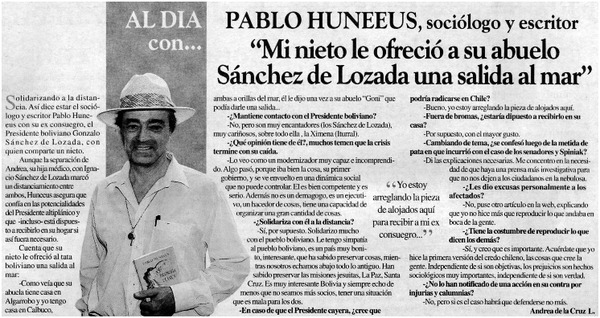 Pablo Huneeus, sociólogo y escritor "Mi nieto le ofreció a su abuelo Sánchez de Lozada una salida al mar" [artículo] Andrea de la Cruz L.