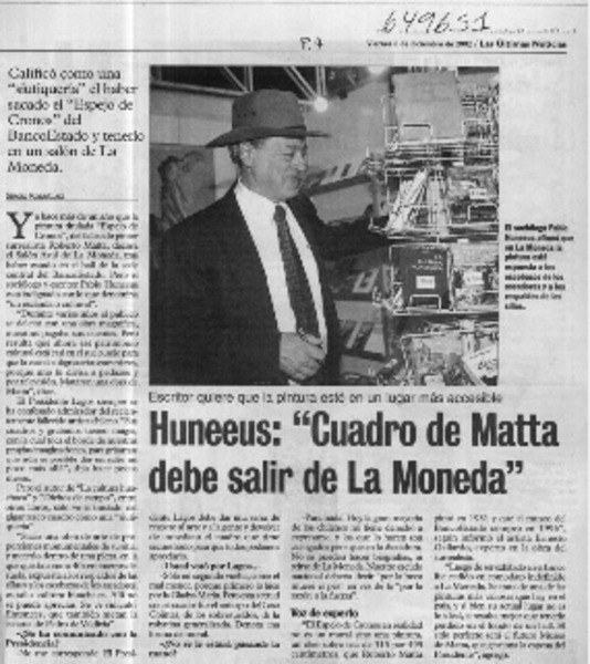 Huneeus, "Cuadro de Matta debe salir de La Moneda" [artículo] Sergio Rodríguez