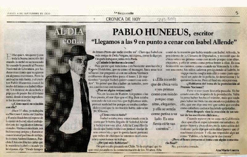 Pablo Huneeus, escritor "Llegamos a las 9 en punto a cenar con Isabel Allende" : [entrevistas] [artículo] Ana María Guerra.