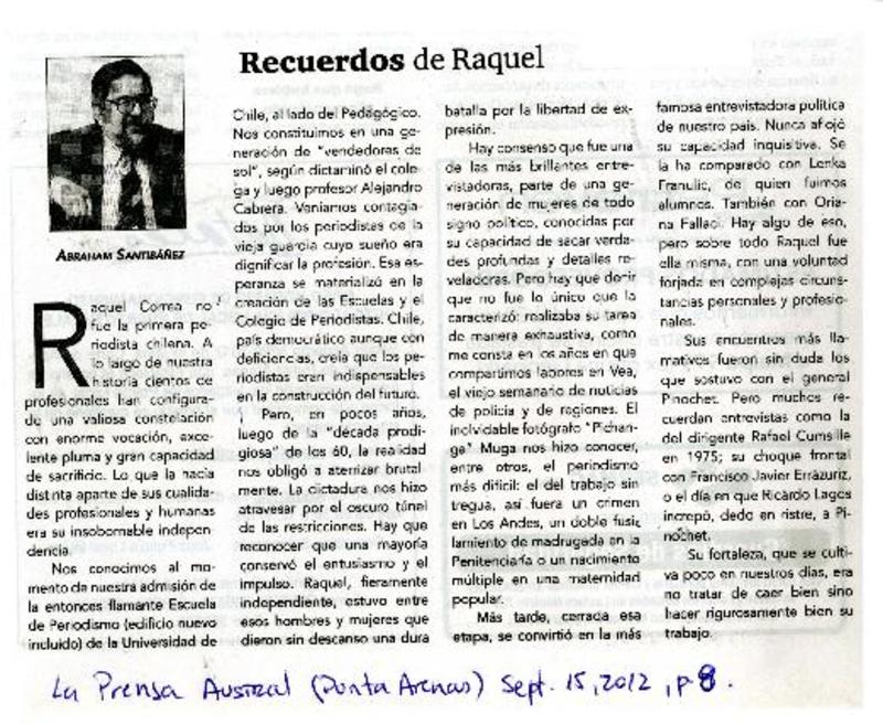 Recuerdos de Raquel [artículo] Abraham Santibáñez.