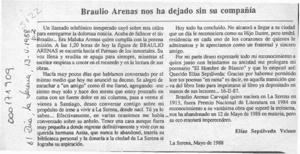 Braulio Arenas nos ha dejado sin su compañía [artículo] Elías Sepúlveda Veloso.