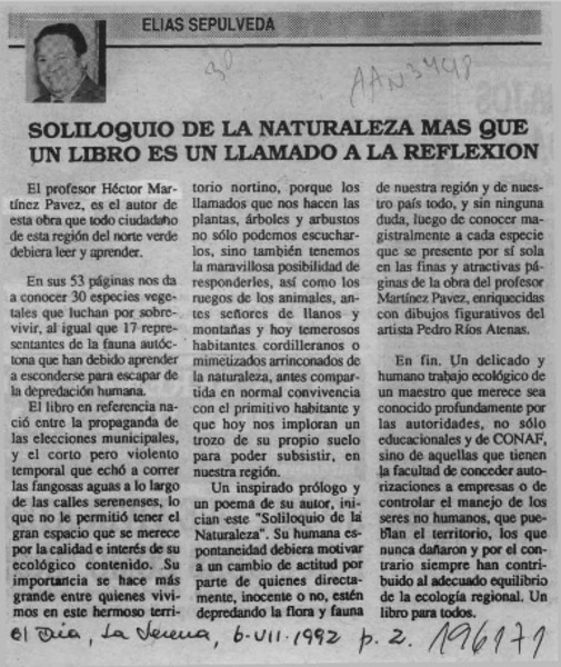 Soliloquio de la naturaleza, más que un libro es un llamado a la reflexión [artículo] Elías Sepulveda.