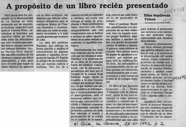 A propósito de un libro recién presentado [artículo] Elías Sepúlveda Veloso.