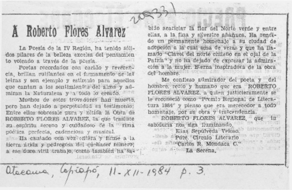 A Roberto Flores Alvarez [artículo] Elías Sepúlveda Veloso.