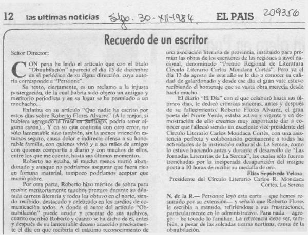 Recuerdo de un escritor [artículo] Eliás Sepúlveda Velosos.