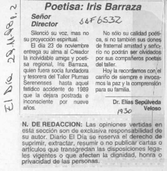 Poetisa: Iris Barraza [artículo] Dr. Elías Sepúlveda Veloso.