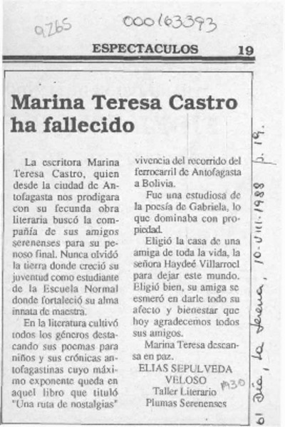 Marina Teresa Castro ha fallecido [artículo] Elías Sepúlveda Veloso.