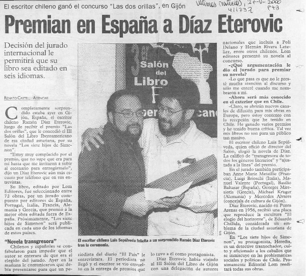 Premian en España a Díaz Eterovic [artículo] Renato Castelli