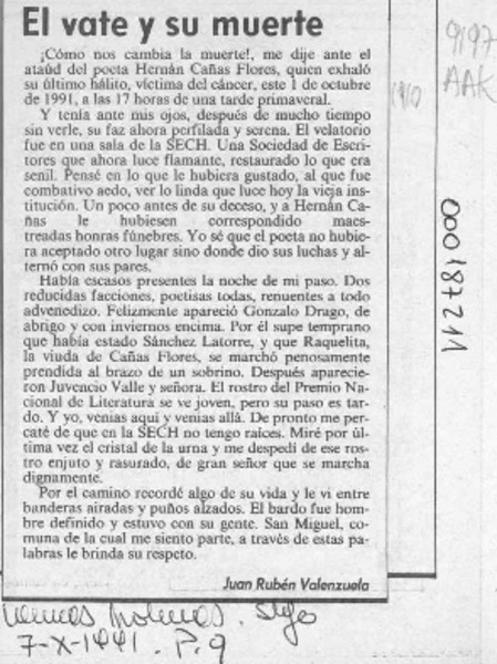 El vate y su muerte [artículo] Juan Rubén Valenzuela.