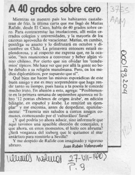A 40 grados sobre cero [artículo] Juan Rubén Valenzuela.