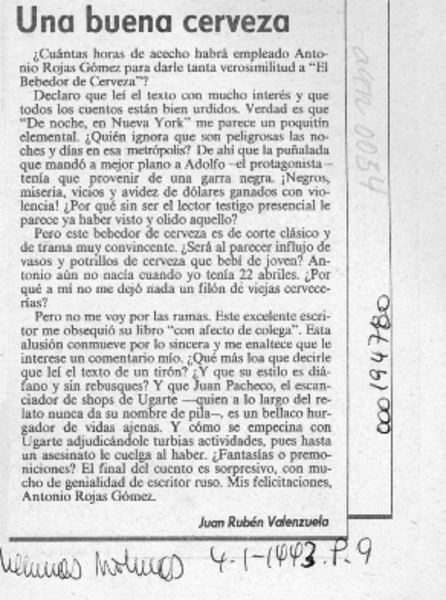 Una buena cerveza [artículo] Juan Rubén Valenzuela.