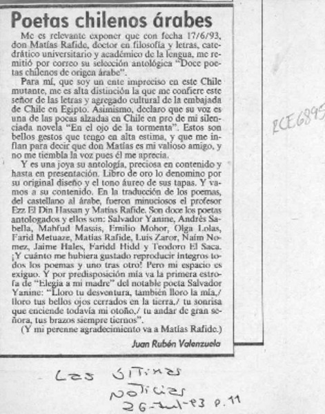 Poetas chilenos árabes [artículo] Juan Rubén Valenzuela.