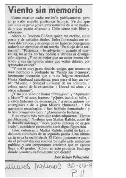 Viento sin memoria [artículo] Juan Rubén Valenzuela.