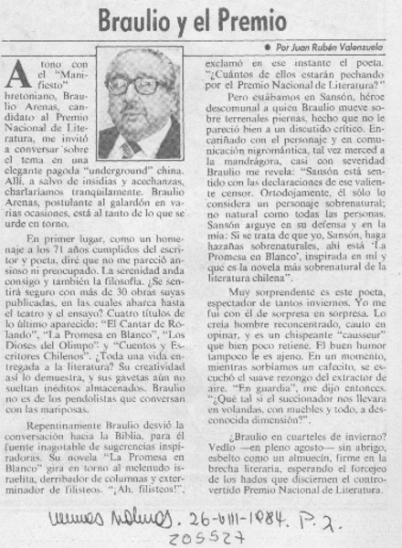 Braulio y el premio [artículo] Juan Rubén Valenzuela.