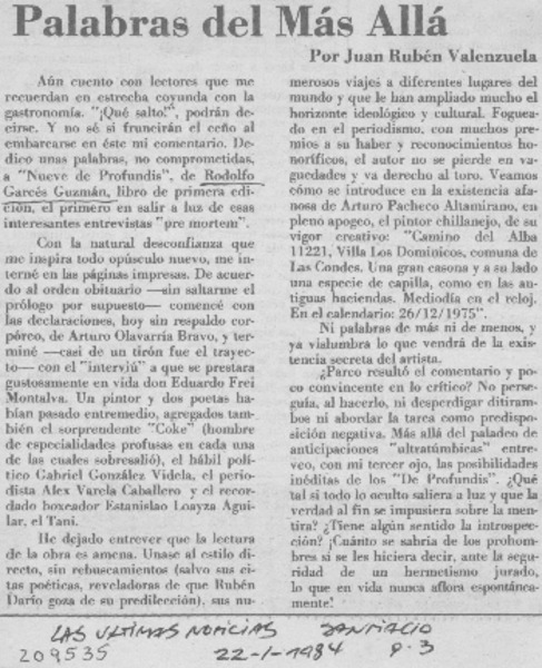 Palabras del más Allá [artículo] Juan Rubén Valenzuela.