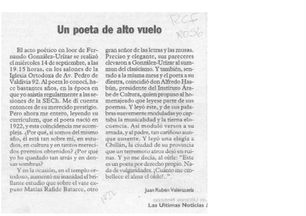 Un poeta de alto vuelo [artículo] Juan Rubén Valenzuela.