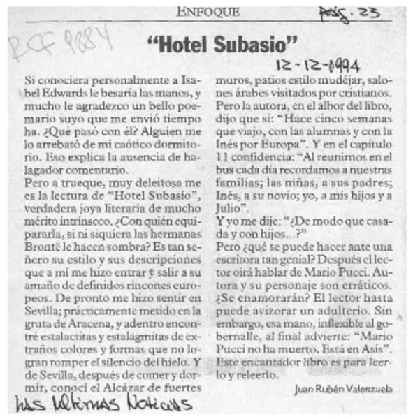 "Hotel Subasio" [artículo] Juan Rubén Valenzuela.