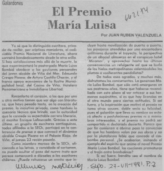 El Premio María Luisa [artículo] Juan Rubén Valenzuela.