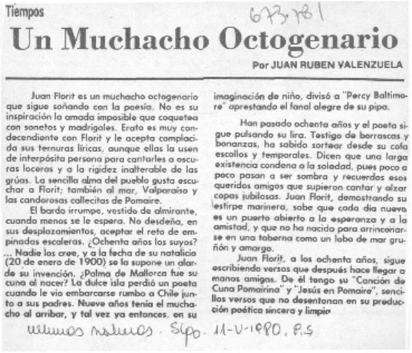 Un muchacho octogenario [artículo] Juan Rubén Valenzuela.
