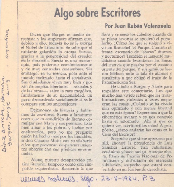 Algo sobre escritores [artículo] Juan Rubén Valenzuela.
