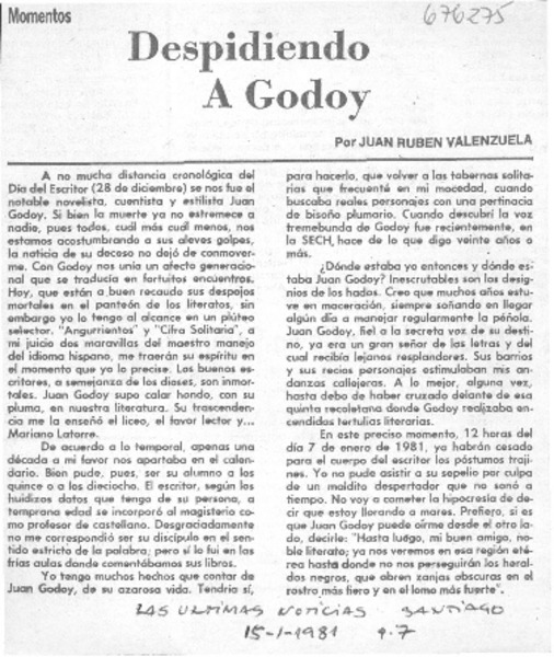 Despidiendo a Godoy [artículo] Juan Rubén Valenzuela.