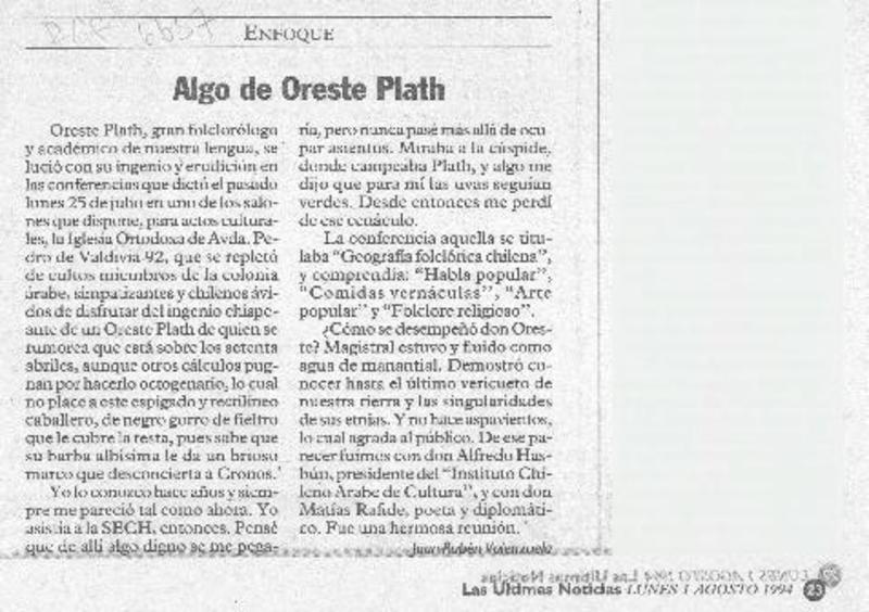 Algo de Oreste Plath [artículo] Juan Rubén Valenzuela.