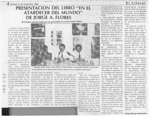 Presentación del libro "En el atardecer del mundo" de Jorge A. Flores [artículo] Diego Muñoz Valenzuela.